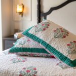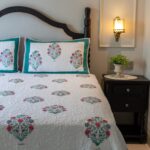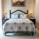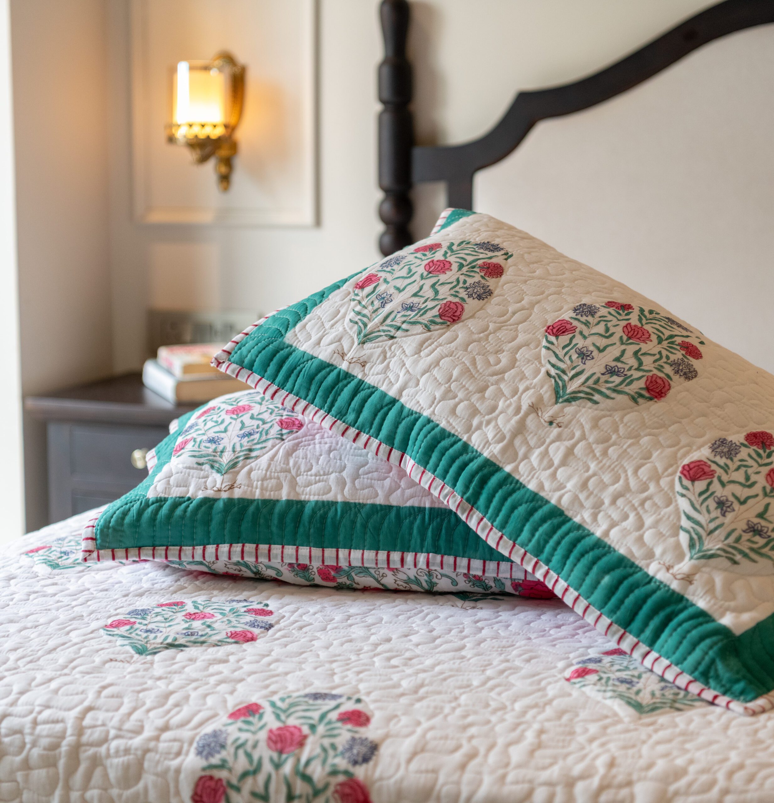 Add warmth and delicate charm to your interiors with this hand block printed quilted bedcover set, adorned with heart-shaped floral motifs in shades of rose pink, lavender, and green on a soft ivory base. The repeating motif is delicately outlined with fine quilting, creating a textured and inviting finish.