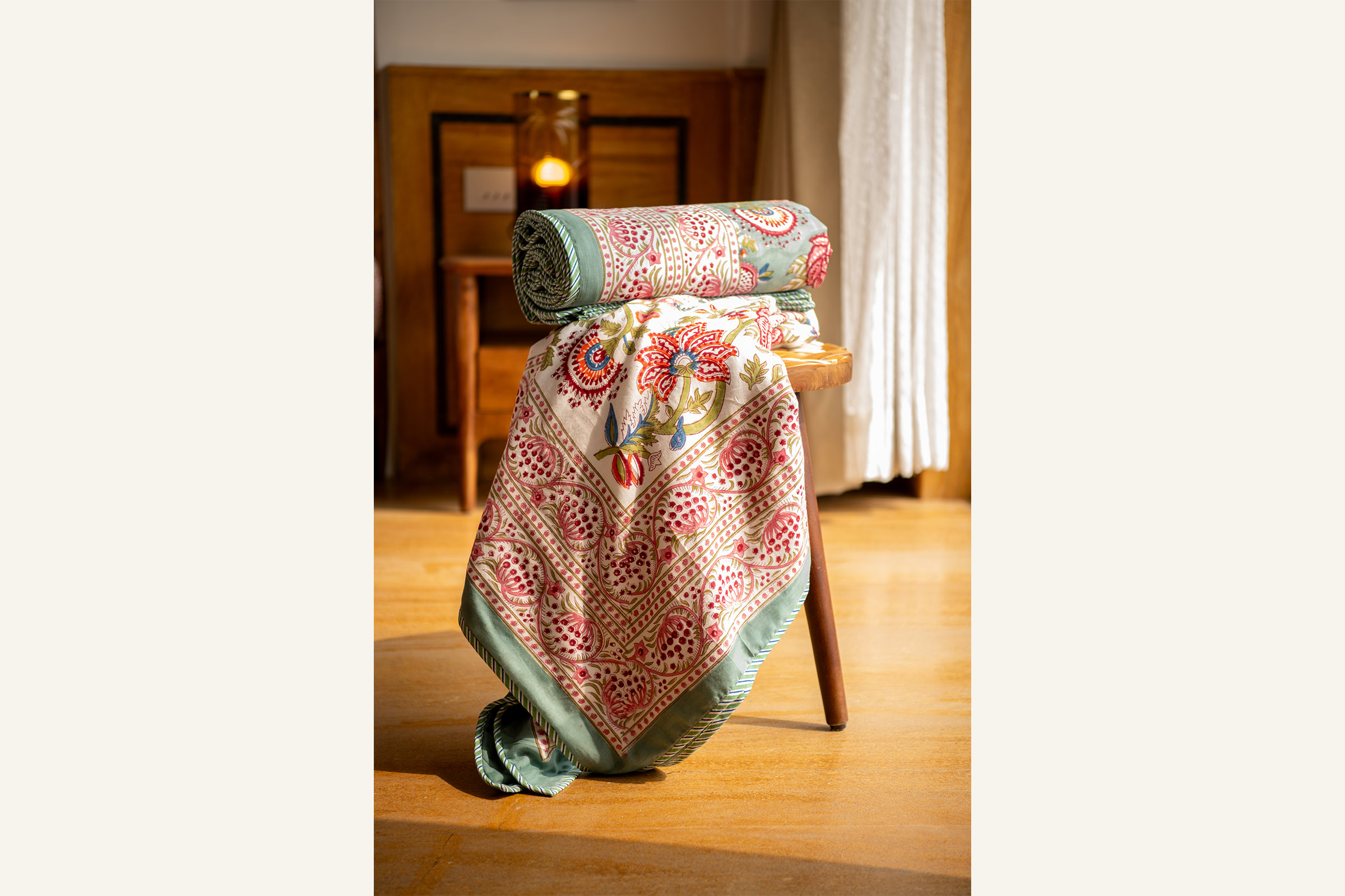 Fresh, joyful, and full of life, Verdant Bloom celebrates spring in its most vibrant form. Hand-blocked floral motifs unfurl across a soft ivory base, brought alive with lively accents of leafy green, coral pink, and gentle hints of sky blue—evoking gardens in full bloom after winter rains.