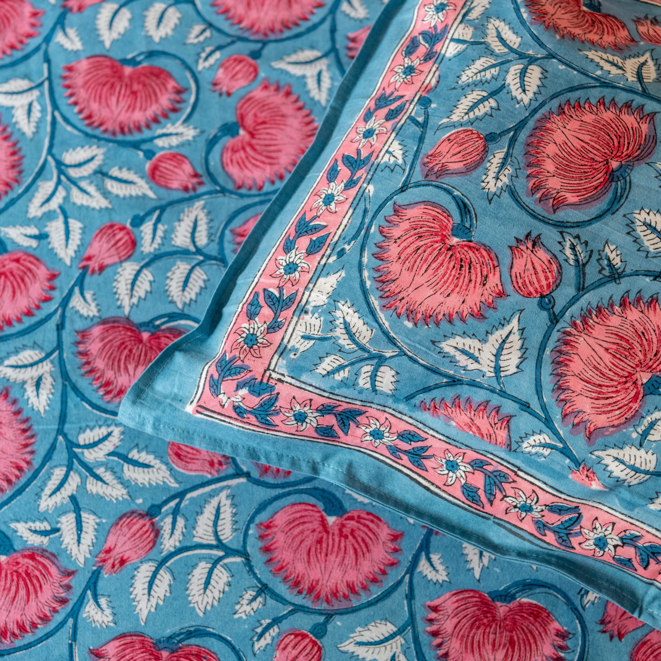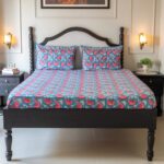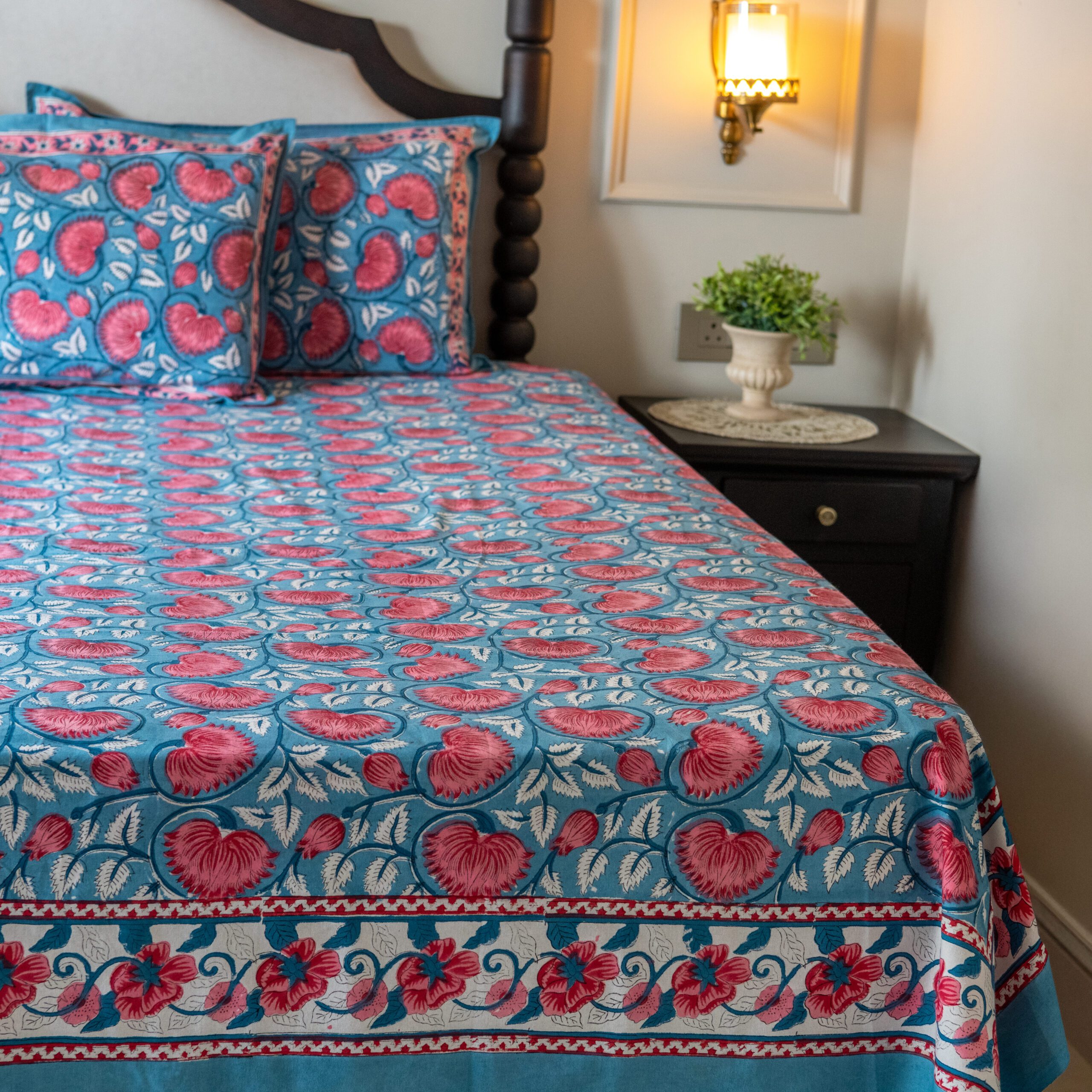 Bring depth and vibrancy to your space with this stunning cotton bedsheet set. Bold pink flowers spread across a rich teal blue base, enhanced by white leafy details and a finely patterned border. The pillow cover is framed with coordinating floral designs, adding balance and refinement to the ensemble. Made from soft, breathable cotton, this set is ideal for introducing a lively and artistic touch to your home.