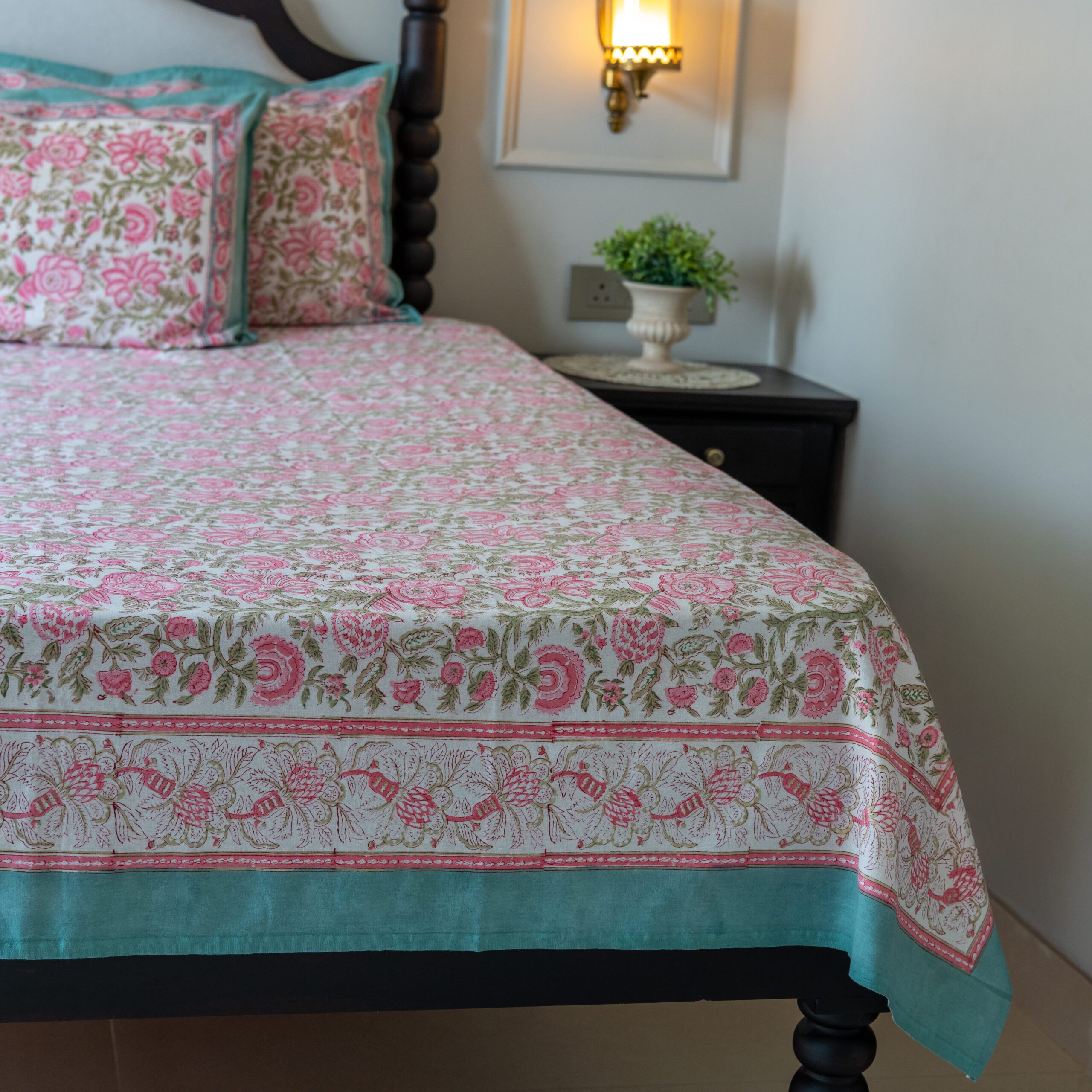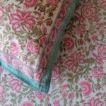 Style your bedroom with this cotton bedsheet set featuring an enchanting floral pattern, adorned in blush pink and sage green florals. The intricate, blooming floral motifs are inspired by traditional Indian textile art, bringing a vintage yet timeless appeal to your space.